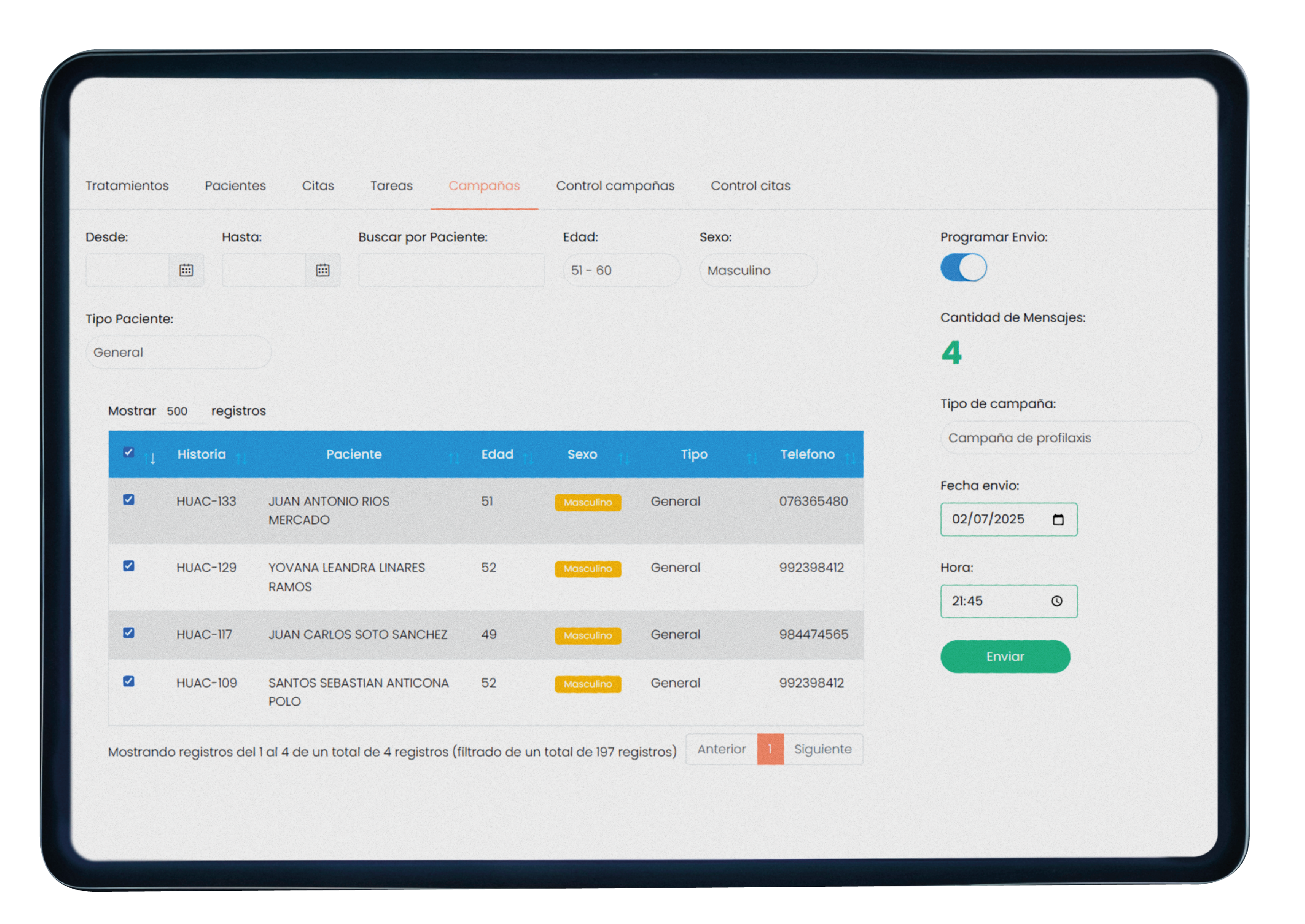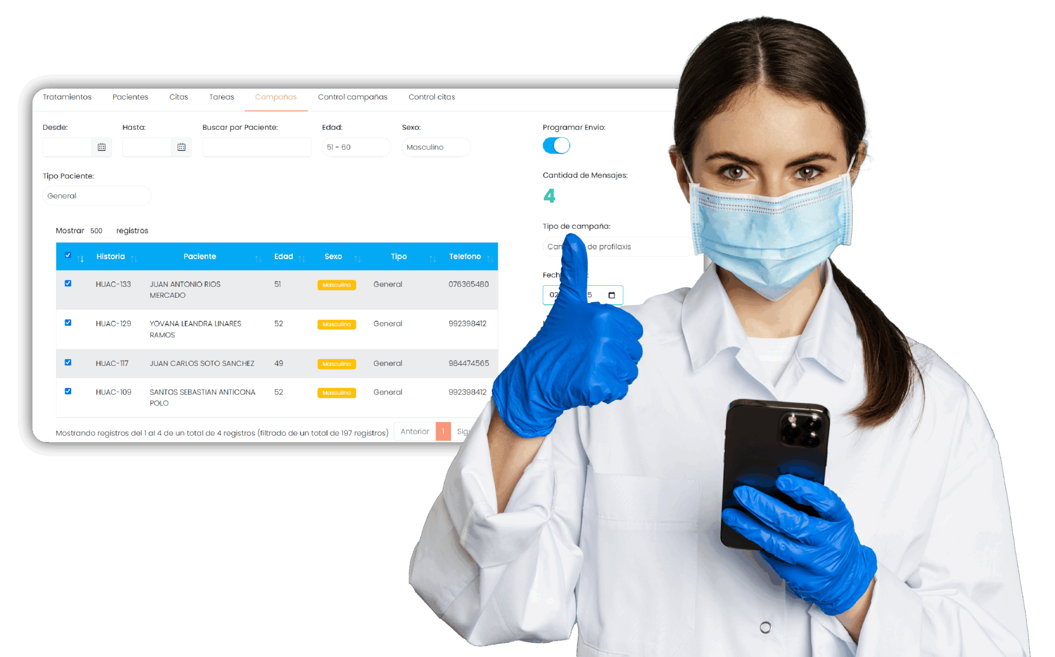 Envía mensajes masivos segmentados según edad, especialidad, sexo, fortaleciendo la comunicación médica y fidelizando pacientes de forma efectiva.