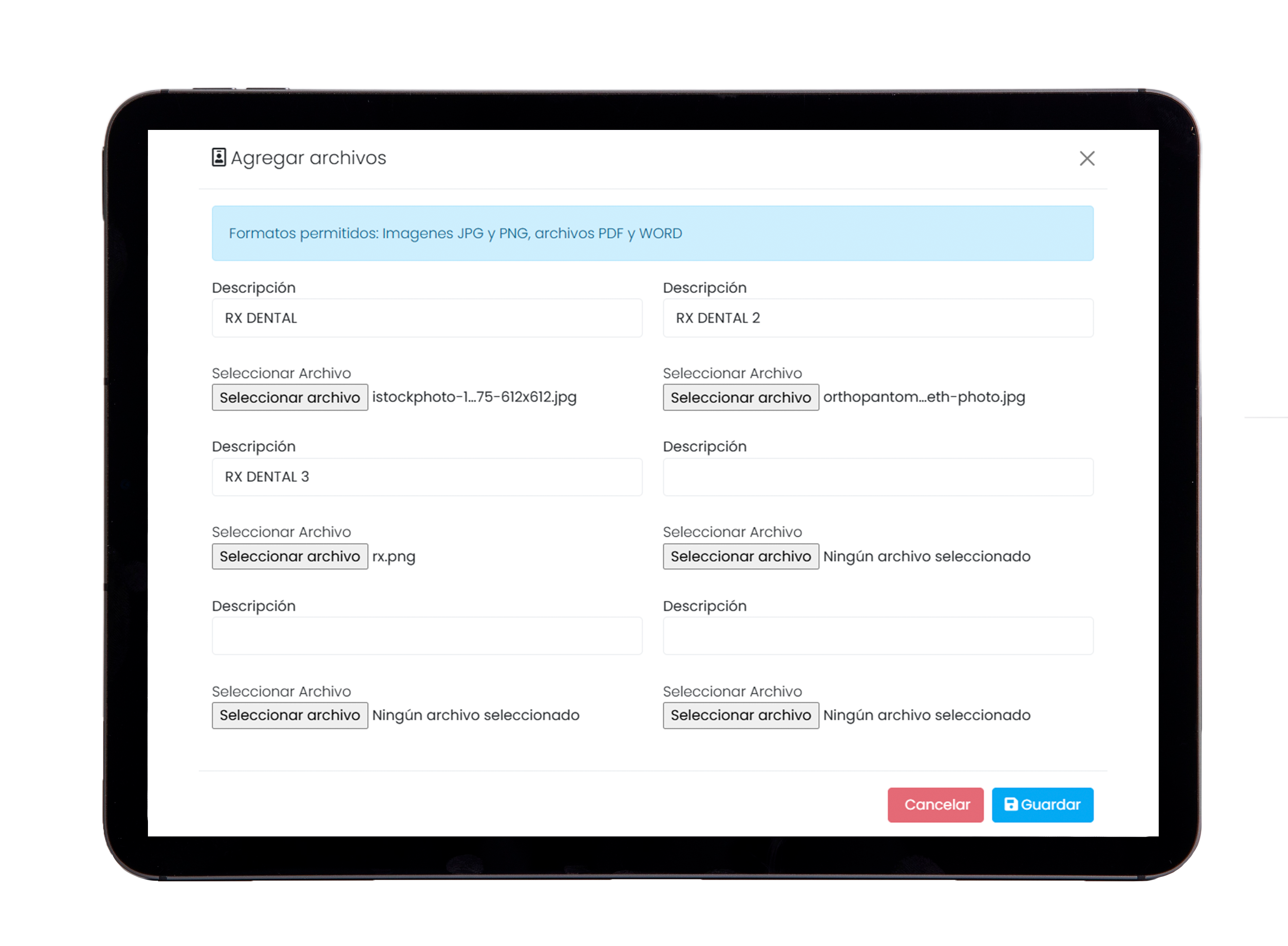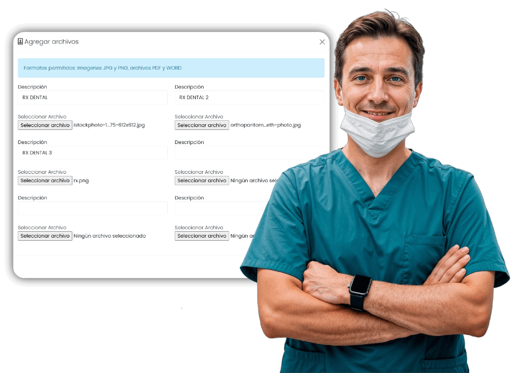 Adjunta exámenes, radiografías, tomografías y otros archivos clínicos directamente al perfil del paciente, centralizando su información para un mejor seguimiento médico.